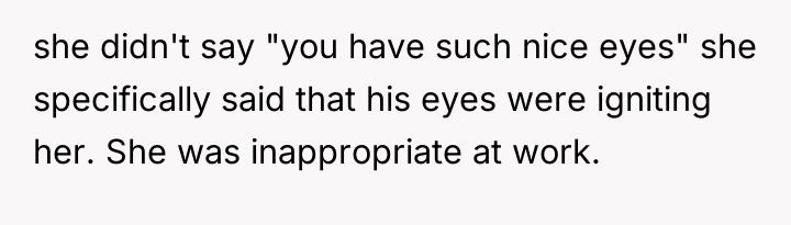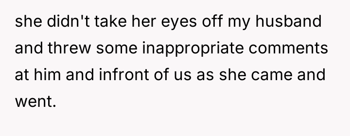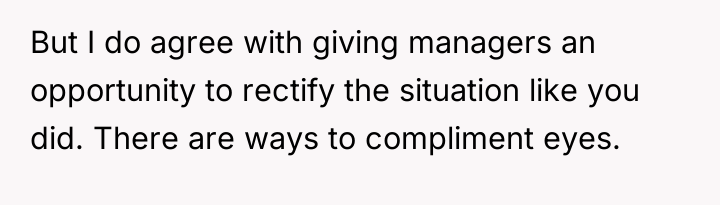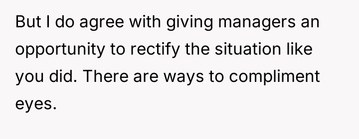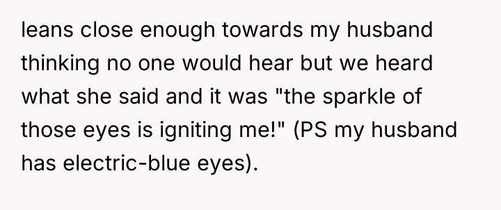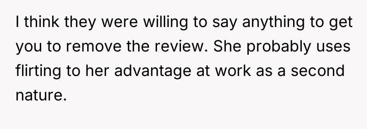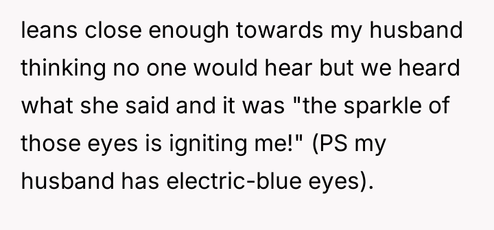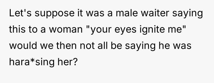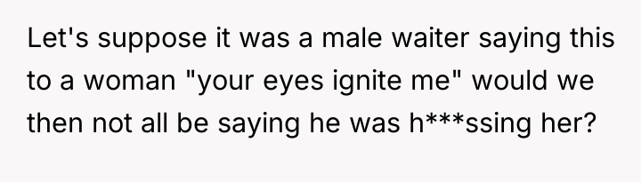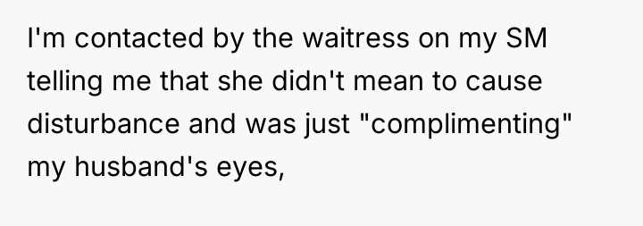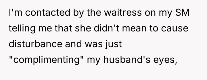 The waitress's behavior, specifically the persistent staring and the highly suggestive comment about the husband's eyes, crossed established professional and social norms. The OP's initial verbal confrontation was a direct, though perhaps heated, attempt to establish a boundary in the moment. However, escalating this to a damaging online review introduced a disproportionate punitive element. While the OP was defending her experience, the manager's interaction reveals a power dynamic where the review was leveraged for professional consequence (firing) rather than purely communicative feedback.