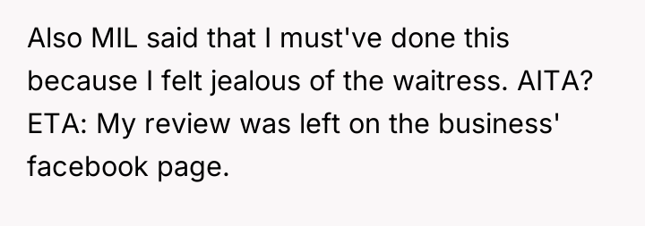 AITA for leaving a bad review on a diner and ruining the waitress' life just because she was "complementing" my husband's eyes?
