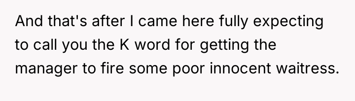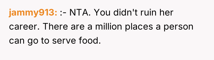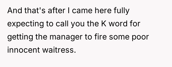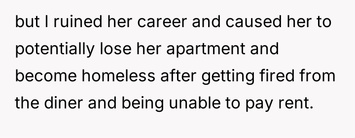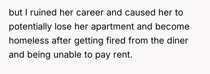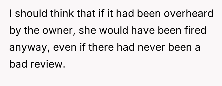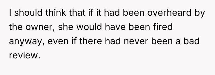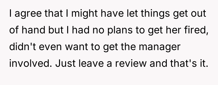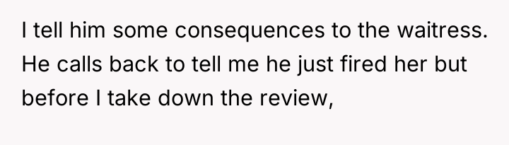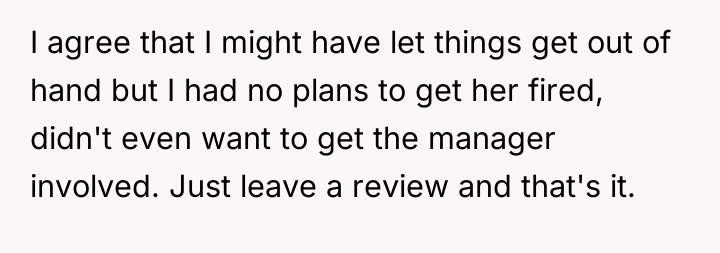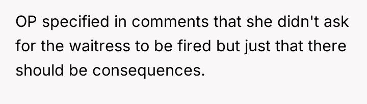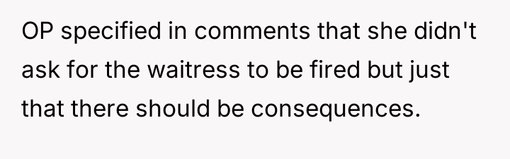 The OP's subsequent admission that she did not intend for the waitress to be fired suggests a mismatch between her action (the public review) and her desired outcome (a correction of behavior). Effective boundary setting often requires foresight regarding the potential downstream effects of one's chosen response.