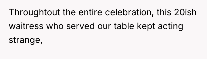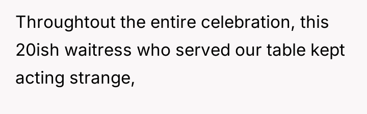 Despite her resolve to maintain peace and dignity, the moment shattered when the waitress leaned in with a chilling whisper that ignited a storm of emotions. Her confrontation was met with smug defiance, leaving her isolated and judged amidst the silent scrutiny of her in-laws, turning a cherished occasion into a night she wished to erase.