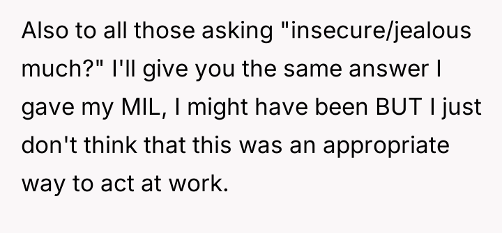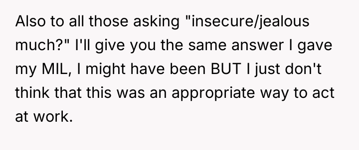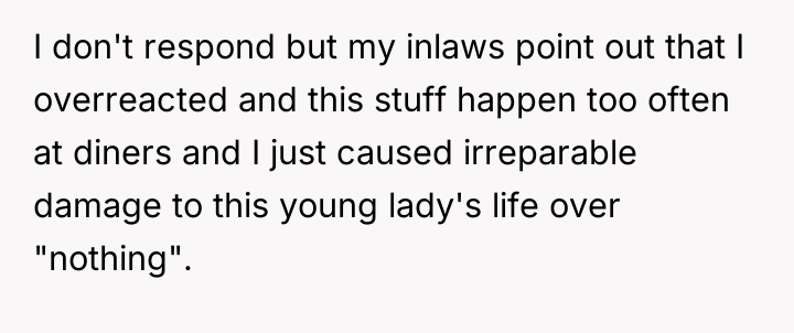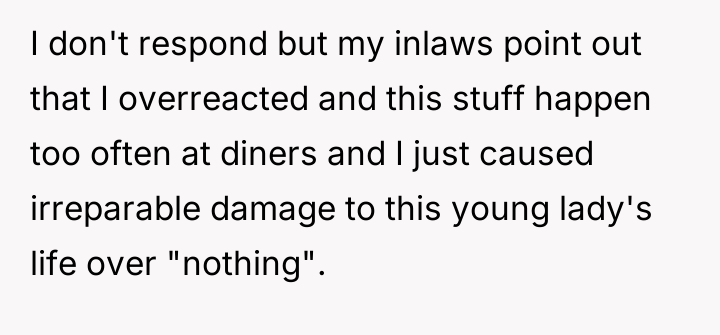 The in-laws' reaction suggests a common societal tendency to minimize service worker misconduct and attribute the OP's response to jealousy. However, the core issue remains the maintenance of appropriate interpersonal conduct in a public setting. A constructive recommendation would involve clearly articulating the boundary to the manager without immediately resorting to reputation-damaging tactics. For future similar events, the OP could state clearly to the manager after the event: 'The employee's behavior was unprofessional and offensive, but I request that you address the behavior internally rather than pursuing punitive action that could impact her livelihood, as my primary goal was to address the immediate offense.'