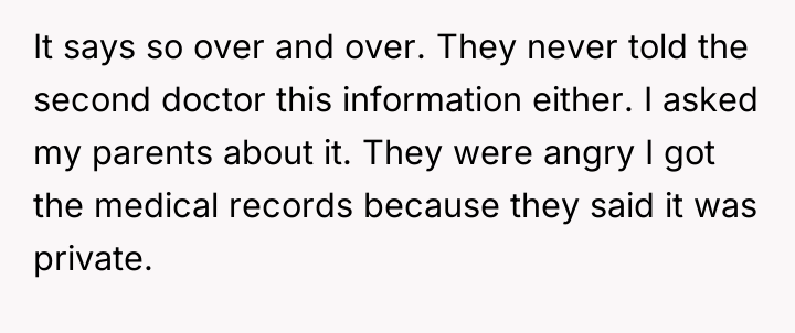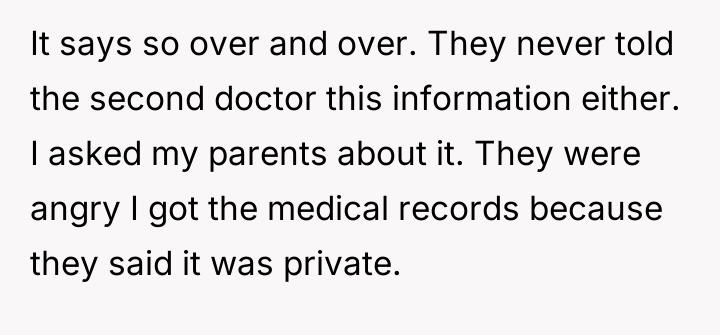 AITA for being mad at my parents because they withheld information about my medical history from me?