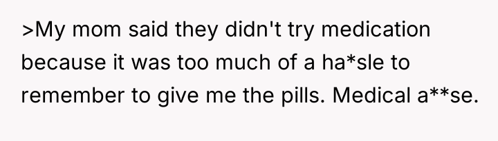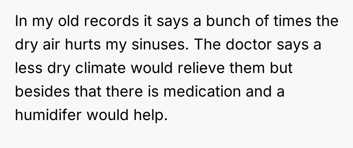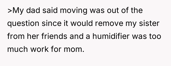 The situation highlights a severe breach of fiduciary duty regarding a child's health. The parents acted as gatekeepers of medical information, making decisions based on their perceived burden ('too much hassle' for medication, 'too much work' for a humidifier) rather than advocating for their child's documented needs. The medical records explicitly indicated that the dry climate exacerbated the condition and offered actionable, non-invasive solutions like medication and environmental control. Withholding this information, especially when the child was actively ridiculed and suffered socially due to the symptoms, demonstrates a failure in parental responsibility and emotional support.
