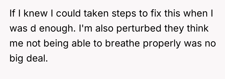 Given the parents' justification that treatment involved too much hassle, was the OP justified in being furious about discovering that a simple change in environment or routine medication could have prevented decades of chronic breathing difficulties, or did the parents have the right to manage medical decisions without full disclosure to their child?