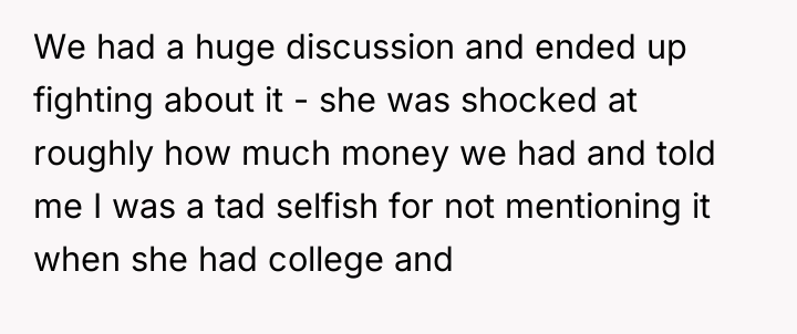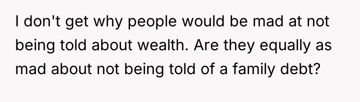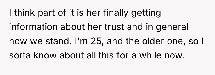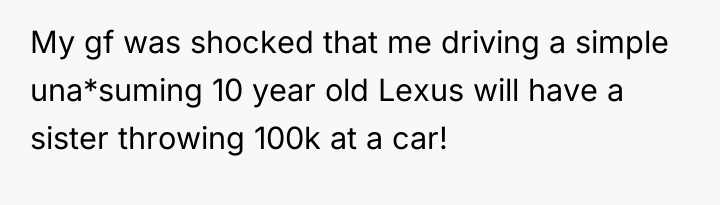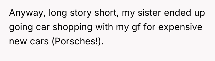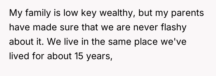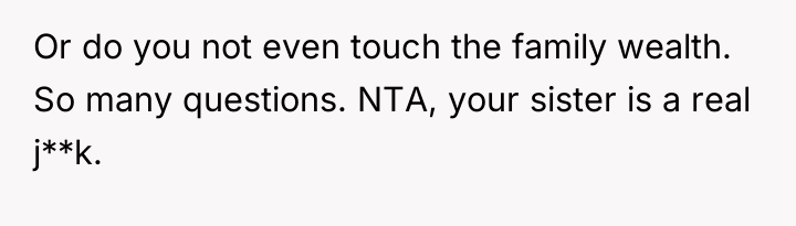 The original poster (OP) is facing conflict due to their sister's perceived entitlement regarding family wealth, which led to an inappropriate attempt to purchase an expensive car. The central tension lies between the OP's belief in maintaining low-key wealth and parental values of experience over objects, versus the sister's immediate demand for tangible wealth distribution, exacerbated by a recent argument about disclosure and perceived selfishness.