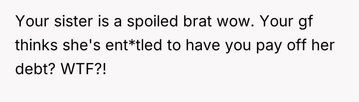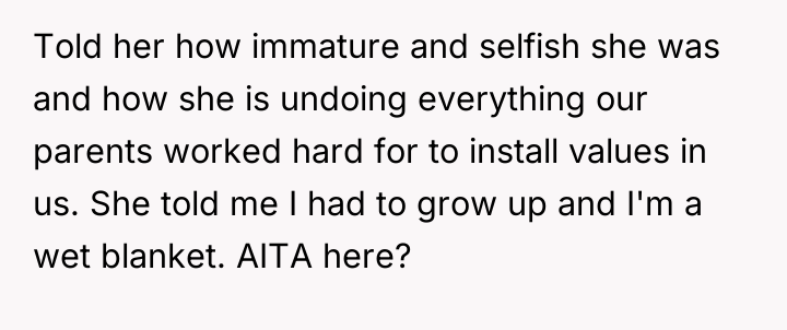 Is the OP justified in confronting their sister so harshly about her entitlement and disregard for family values, or should the OP have been more forthcoming about the family's financial standing earlier, especially considering their girlfriend's shock and the sister's existing debts?