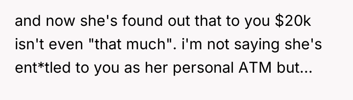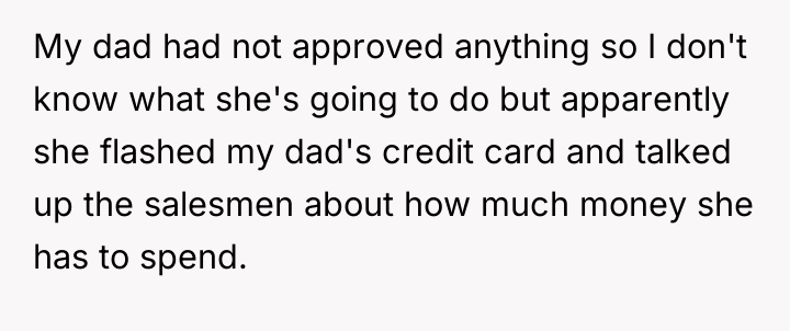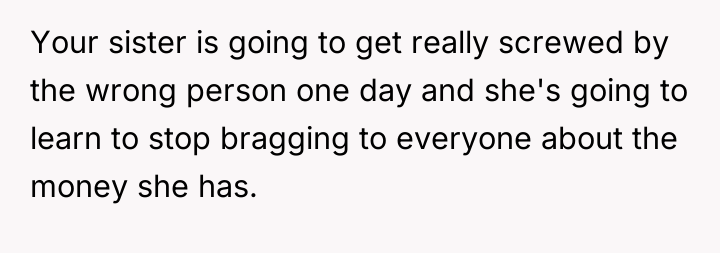 As renowned family therapist Dr. Terry Real explains, “The most important thing you can do in a family system is to be the one who takes responsibility for their own peace.” In this situation, both siblings are failing to take responsibility for healthy communication, instead reacting with judgment and defensiveness. The sister's behavior—flashily attempting a high-value purchase and demanding a share of wealth—suggests deep-seated feelings of entitlement, possibly stemming from a lack of clear boundaries regarding finances as she grew up, even if the parents tried to instill humility.
