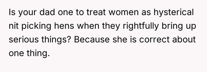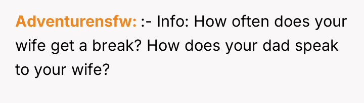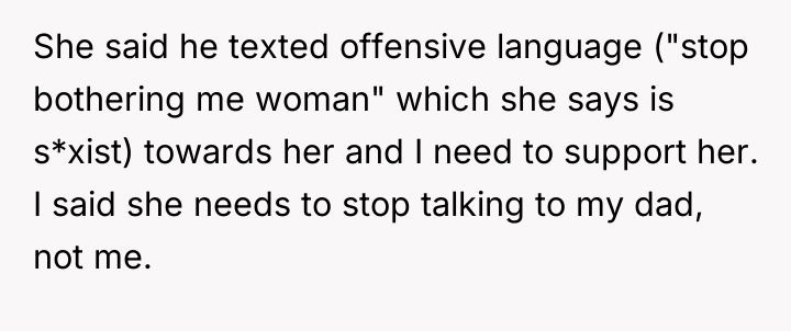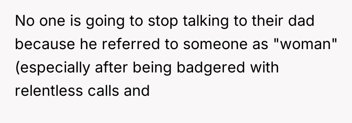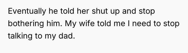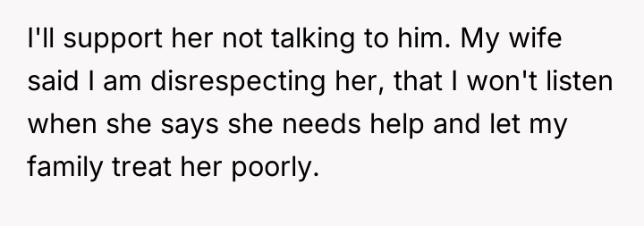 The OP's defense, suggesting the wife "creates these situations herself" by "look[ing] for offense," deflects accountability for how his actions (or inaction regarding her requests) are received. While the wife's reaction to the father's language was strong, the OP's response—supporting her avoidance of the father but refusing to stop communicating with him himself—is a mixed message that fails to fully validate her feeling of being disrespected by the family unit. Moving forward, the OP should focus on validating the wife's expressed need for support first, and then collaboratively address external issues like the father's actions, ensuring decisions about children are made jointly.