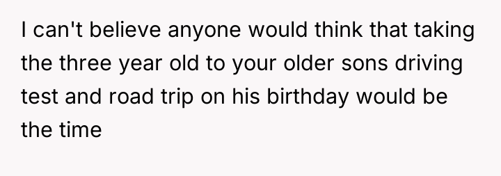 The original poster (OP) prioritized their oldest son's birthday celebration and subsequent driving test preparation over their wife's request for a day alone, leading to significant conflict and resulting in the wife feeling unsupported and disrespected, especially regarding the unexpected gift from the OP's father.