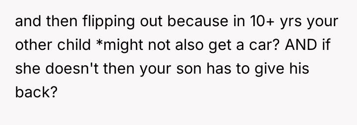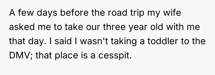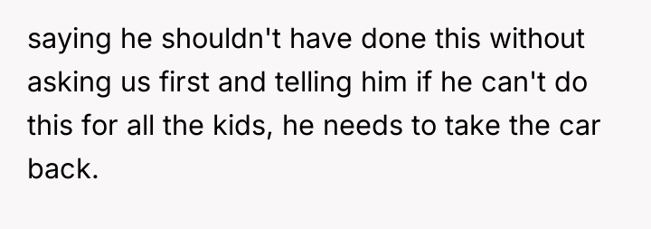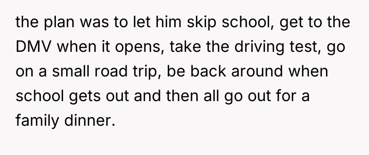 The initial conflict revolved around scheduling and differing priorities: the OP focused on the logistics of the driving test and the significance of the son's birthday, while the wife expressed a clear need for respite and acknowledgement of her contributions ("a hundred sacrifices"). The OP's dismissal of her need—even by prioritizing another commitment—was interpreted as a failure to value her emotional labor and well-being, escalating the fight. The subsequent issue with the father's car gift introduced an external dynamic that the wife perceived as financial favoritism or unequal treatment among the children, further eroding her sense of security and partnership within the marriage.