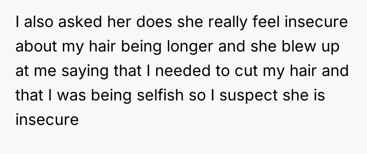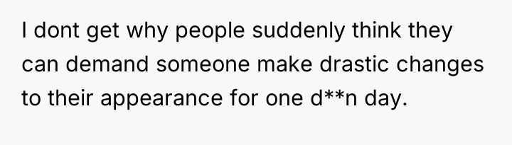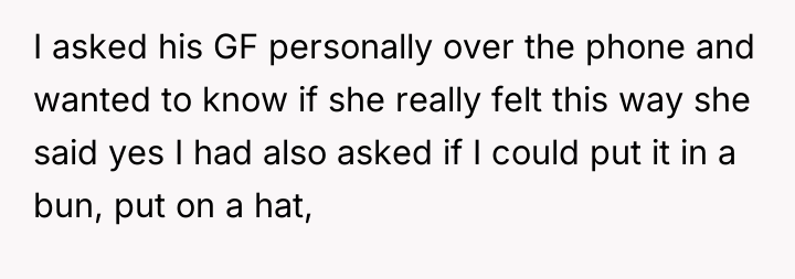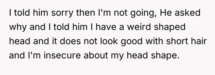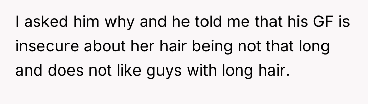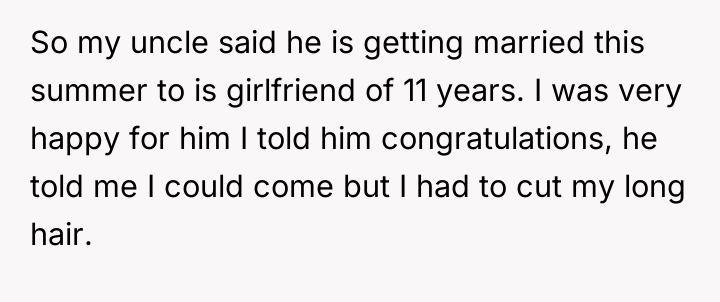 This situation centers on a clear clash of boundaries and expectations. The OP established a boundary regarding his physical appearance (his hair length, linked to his insecurity about his head shape), while the groom's girlfriend attempted to impose a boundary on his appearance as a condition for his participation in the wedding. The OP's initial interaction confirming the girlfriend's demand, including the rejection of reasonable compromises like tying the hair up, suggests the request was rooted in the girlfriend's specific insecurity, as she reacted defensively when questioned directly.