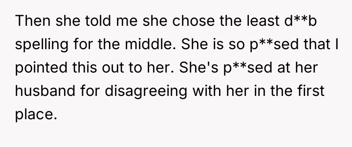 While the OP's information was factually correct regarding the Scottish origin of the first name and the Americanized spelling of the middle name, the timing and delivery were highly inappropriate, violating the social boundary protecting a new parent’s joy. The SIL's reaction—becoming defensive and lashing out—is a common response when deeply held personal narratives are invalidated. Furthermore, the SIL's comment about choosing the 'least dumb spelling' suggests underlying insecurity about the name choice itself, which the OP's correction amplified.