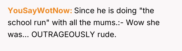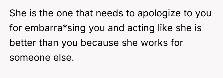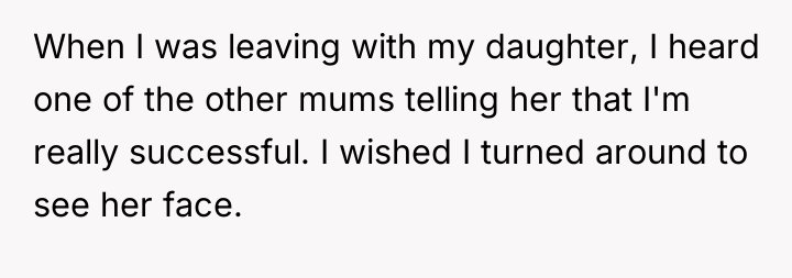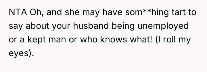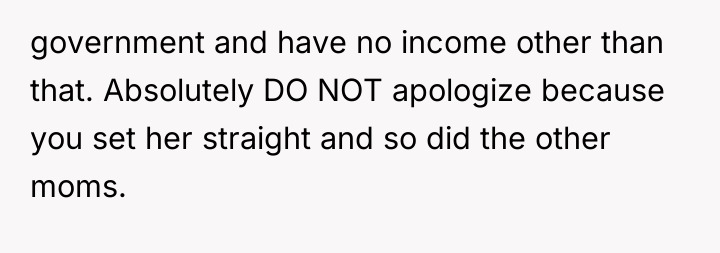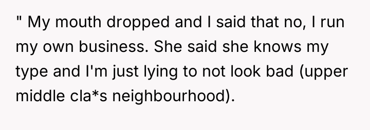 The other mother projected her own assumptions about class and employment onto the OP, moving quickly from simple inquiry to outright accusation and insult. The OP’s reaction—using profanity and labeling the other person an "asshole"—was an immediate, albeit emotionally charged, defense of her professional identity and self-worth. While understandable given the provocation, such a response shifts the dynamic from setting a boundary ("Do not judge my income") to engaging in mutual escalation, which can indeed make future interactions uncomfortable.