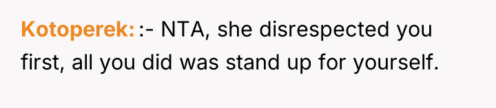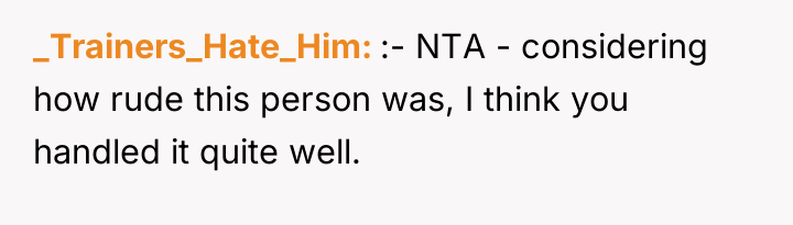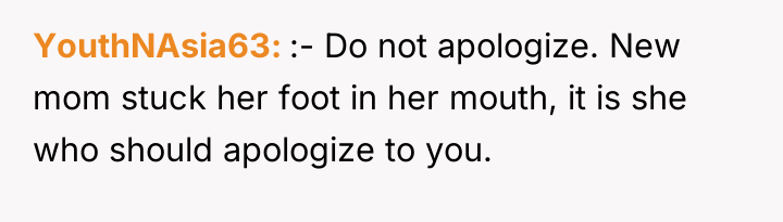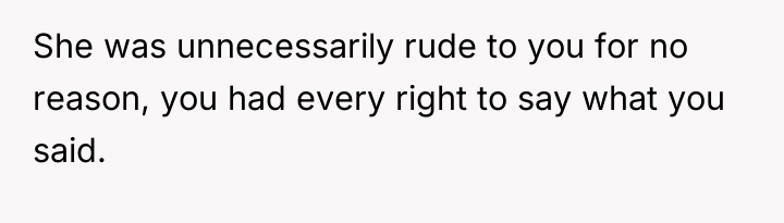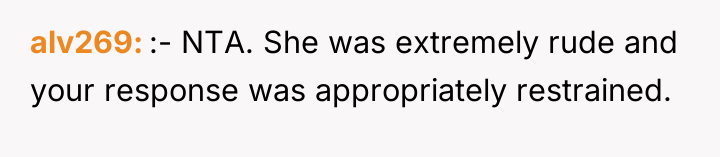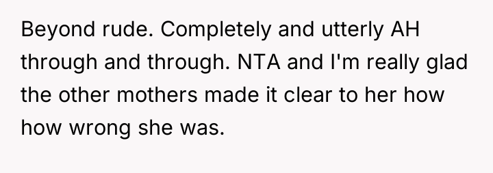 Given the highly inappropriate and insulting nature of the other mother's comments, was the OP justified in her sharp retort, or should she have maintained composure to de-escalate the situation immediately? The question remains whether prioritizing self-respect over immediate social harmony was the correct choice in this public interaction.