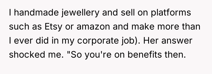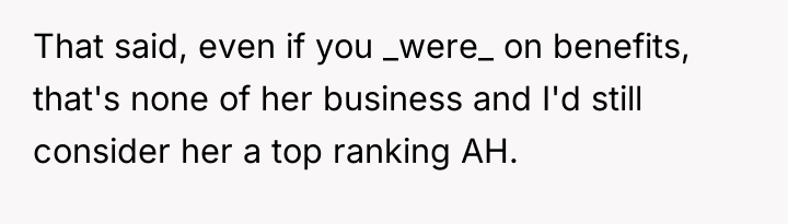 The original poster (OP) faced an unexpected and aggressive confrontation regarding the nature of her employment, reacting defensively when wrongly accused of being on benefits. The central conflict lies between the OP's justified anger at being insulted and judged, and her subsequent worry that her heated response might have created unnecessary long-term awkwardness, particularly for her husband, at the school gates.