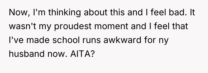 The OP’s feeling of guilt is likely misplaced concerning the defense itself, but valid regarding the potential fallout. A more effective approach might have involved a firm, boundary-setting statement without resorting to reciprocal insults (e.g., "I assure you, I am self-employed and successful; that topic is private"). For future encounters, the OP should aim to maintain a polite but distant demeanor with this individual, focusing on positive interactions with the other mothers, thereby insulating her husband from any perceived awkwardness.
