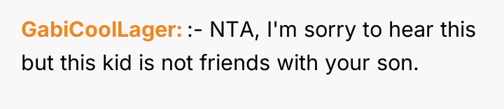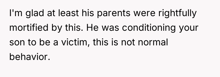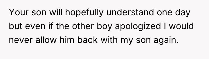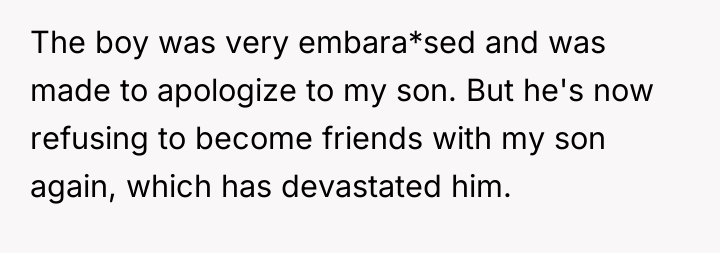 The neighbor parents' reaction was appropriate in addressing the bullying publicly, but the subsequent refusal of their son to maintain the friendship is a predictable consequence when public shaming occurs. Moving forward, the parent should focus on repairing the trust breach with their son, validating his feelings about the lost friendship while affirming that the bullying behavior itself was unacceptable. Future interventions should prioritize collaborative planning with the son, focusing on teaching him how to enforce his own boundaries or, if intervention is necessary, communicating that boundary enforcement to him beforehand.