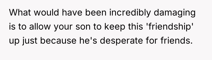 The parent's motivation stemmed from a powerful need to protect their disabled and previously isolated son, especially given the use of a severe slur. However, involving the other parents against the son's explicit request undermined his autonomy. For a 13-year-old, especially one struggling with social acceptance, the opportunity for friendship was extremely valuable, leading him to tolerate abuse to maintain it. When the parent intervened, they effectively ended the friendship themselves, replacing external conflict (the bully) with internal conflict (parent-child trust issue).