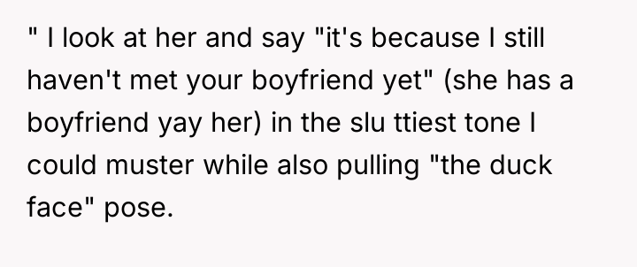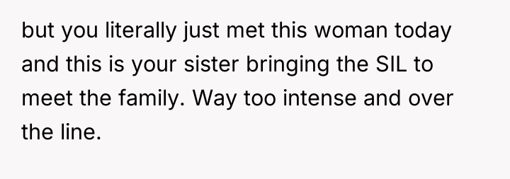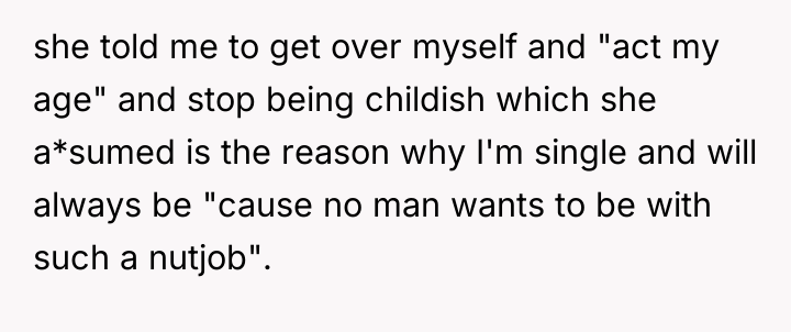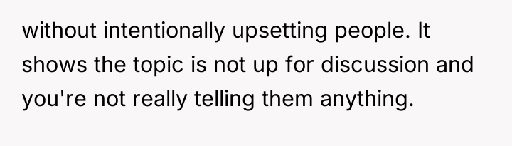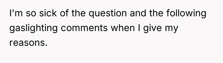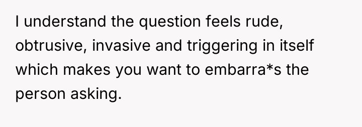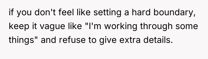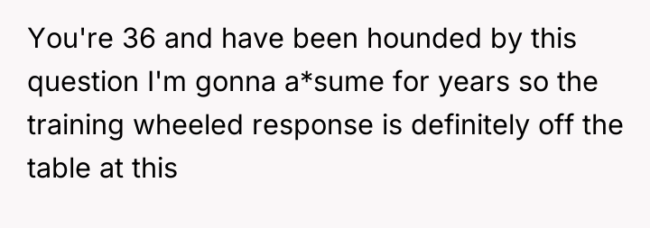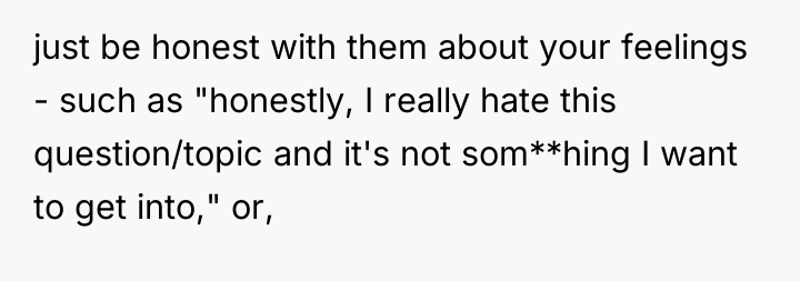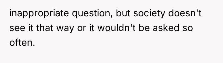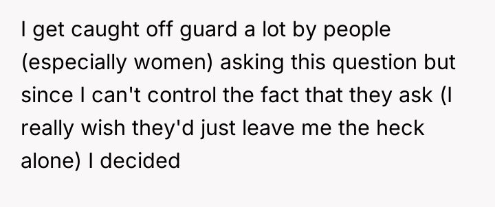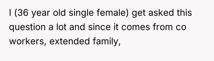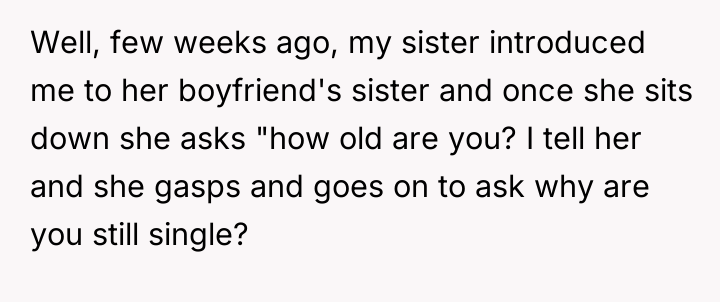 The OP is experiencing a common conflict where societal expectations (that single, successful women must provide a reason for their status) clash with the deeply personal right to privacy. Her initial responses were ineffective because they were reactive and still engaged with the premise of the question. The shift to a provocative, boundary-testing remark—though rooted in a desire for power—is an extreme reaction to feeling persistently violated and pitied. This action successfully stopped the immediate line of questioning but did so by introducing shock and conflict, as seen in the sister's reaction and the boyfriend's expectation of an apology.
