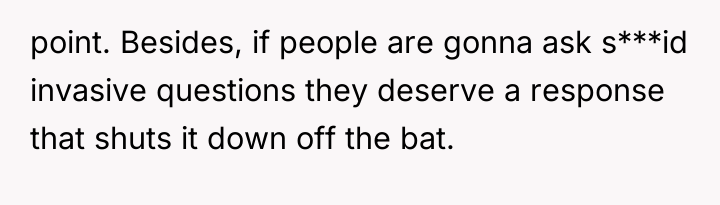 Was the OP justified in using a deliberately shocking, passive-aggressive remark to defend her privacy against intrusive questioning, or did her response escalate the situation unnecessarily, causing relational harm? Is the right to privacy worth temporarily sacrificing polite social standing in these specific interactions?