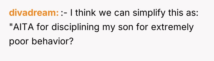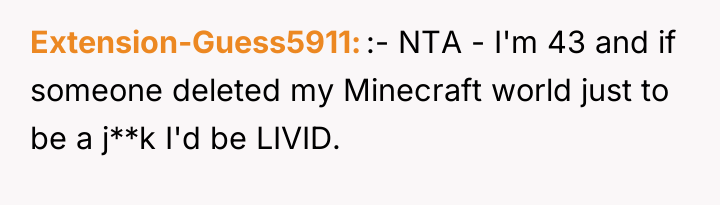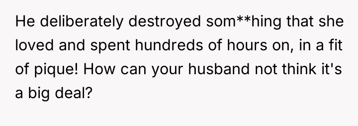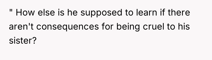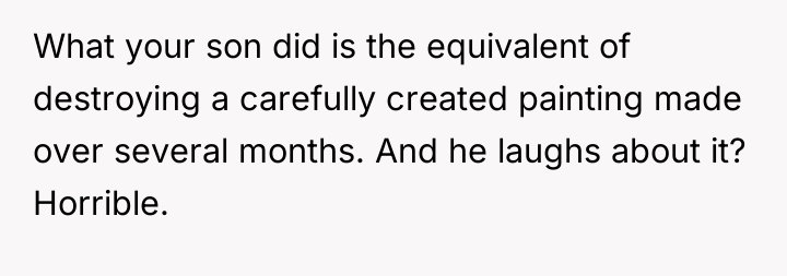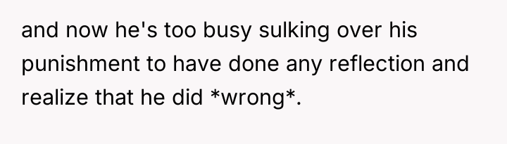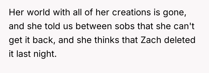As renowned family therapist and author Dr. Laura Markham explains, “Consequences should be related to the misbehavior and delivered calmly, not as a form of revenge.” In this situation, the son's action—deleting his sister's year-long creative work out of spite after being denied access—is a significant act of destruction driven by poor emotional regulation and boundary violation.