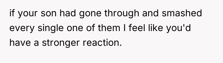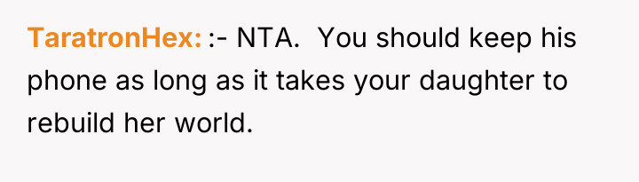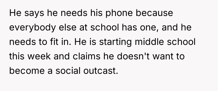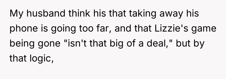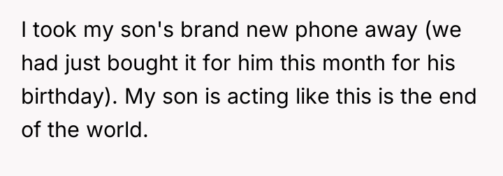 The parent's reaction to take away the phone, while stemming from a valid desire to hold the son accountable for the damage, risks becoming punitive rather than corrective. The son's distress over losing the phone is genuine for his social world, mirroring the sister's distress over her lost world, but the one-month removal is severe, especially for a child starting middle school. The husband's minimization of the daughter's loss further complicates the situation by failing to validate one child's feelings while defending the other's action.