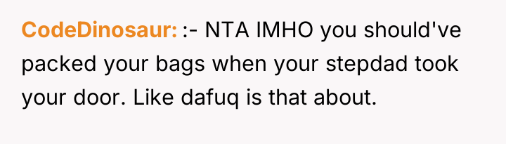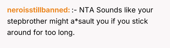The original poster (OP) is clearly experiencing severe emotional distress, feeling trapped and violated within their mother's home due to the actions of their stepbrother and the inaction of their mother and stepdad. The central conflict lies between the OP's fundamental need for personal space, autonomy, and safety, and the family's dysfunctional dynamic where the OP is implicitly expected to absorb the conflict and cater to the stepbrother's demanding behavior.