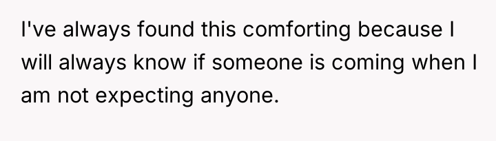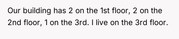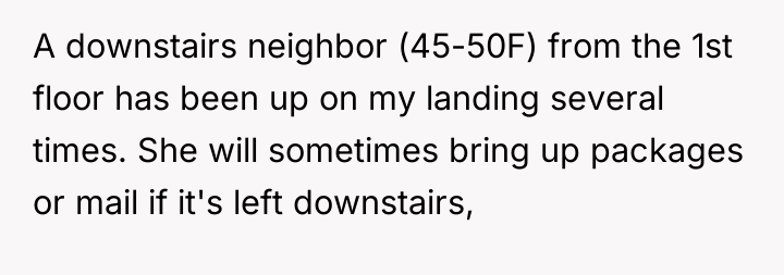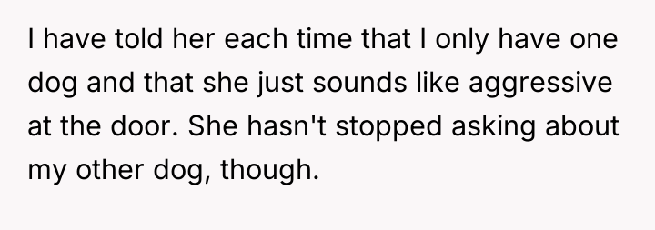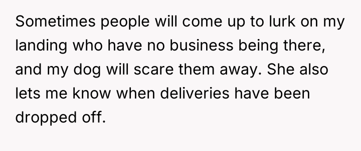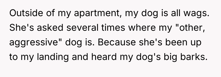 The OP’s motivation for fostering their dog’s door-alert barking is entirely understandable given the living situation in a high-crime area; this behavior serves as an unpaid, constant security system. The neighbor’s repeated, uninvited presence on the third-floor landing, coupled with persistent, probing questions about a supposed second dog, clearly indicates an established boundary violation. The neighbor’s actions—moving the doormat and bending near the door—suggest an attempt to covertly gather information or observe the OP, which elevates the situation from simple curiosity to potential surveillance.