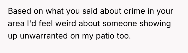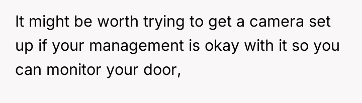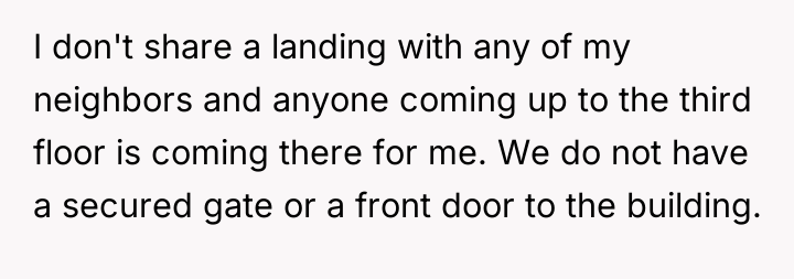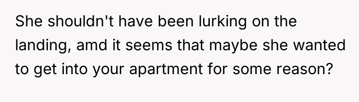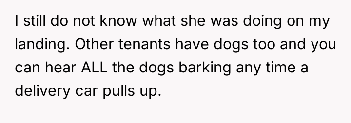 The OP’s response, while reactive, can be viewed as an abrupt enforcement of a boundary that had been ignored through indirect means. However, swinging the door open forcefully, even if intended only to startle, carried a significant physical risk to the neighbor, making the OP's immediate action disproportionate to the perceived threat at that exact moment. Moving forward, the OP should focus on formalizing security measures (e.g., better locks, security camera notification to management) and avoiding physical confrontation. If the neighbor returns, the OP should communicate clearly, perhaps in writing via management, that uninvited presence on the landing is unwelcome, rather than relying on the dog as the sole enforcer.