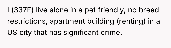 In a city shadowed by crime, a woman lives alone on the third floor of a small, unsecured apartment building. Her only companion is a gentle 40-pound dog whose fierce bark is the thin line between safety and vulnerability, a guardian forged not from aggression but from the necessity of survival.