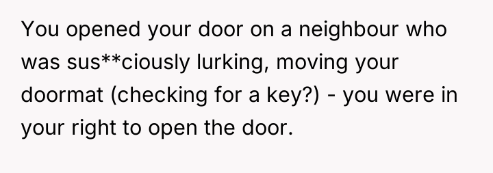 Was the OP's reaction of opening the door and startling the neighbor justified as a defense against potential intrusion, or did the deliberate act of frightening the neighbor constitute an excessive and potentially harmful response to what might have been a less malicious action?
