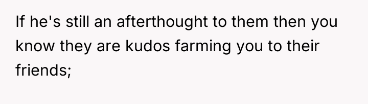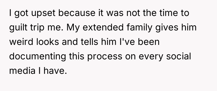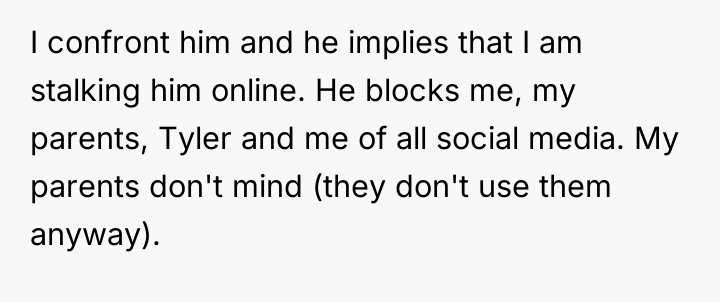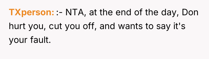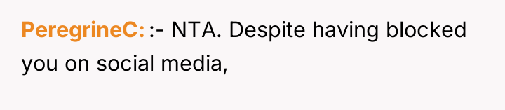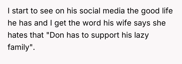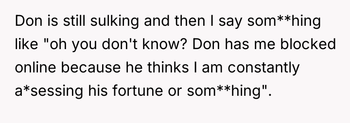 Don’s behavior—accepting significant support and then becoming unreachable and dismissive once financially stable, compounded by the alleged comments from his wife—suggests a significant shift in perceived power dynamics and emotional labor imbalance. His subsequent blocking of the OP and others, framed as avoiding being 'assessed,' is a defensive maneuver to avoid accountability for his lack of reciprocity. The OP’s action of revealing the block during the celebration, while emotionally charged and perhaps poorly timed, was an attempt to dismantle Don’s attempt to play the victim in a public forum where the facts of his isolation were known by the wider family.