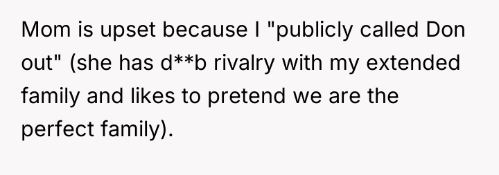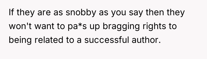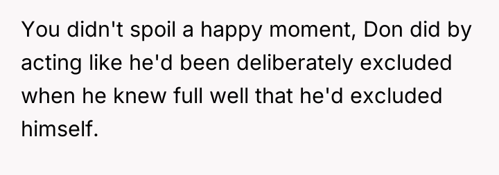 The OP’s action was understandable given the preceding context of rejection and perceived unfairness, but it was not the most constructive path for immediate celebration. A more effective approach would have been to maintain focus on the book launch and address the relational breach privately later, perhaps through a direct, calm conversation with Don outside of family calls. Moving forward, the OP needs to formally establish new, clear boundaries regarding communication and financial expectations with Don to manage future interactions based on their current, unequal standing.