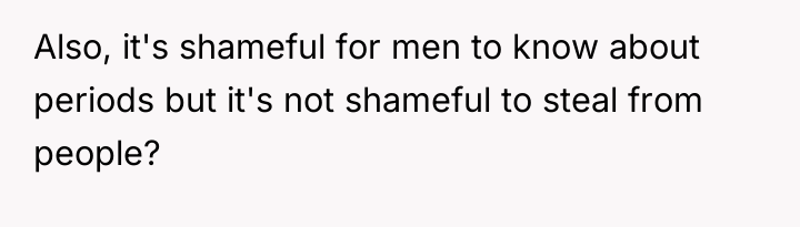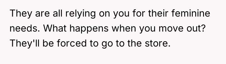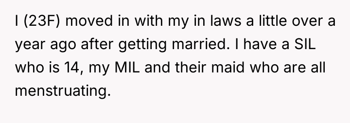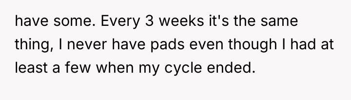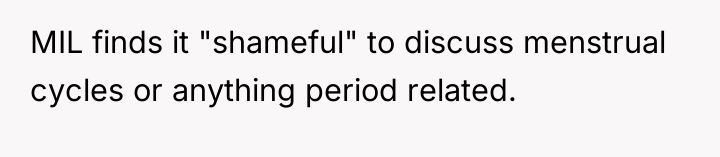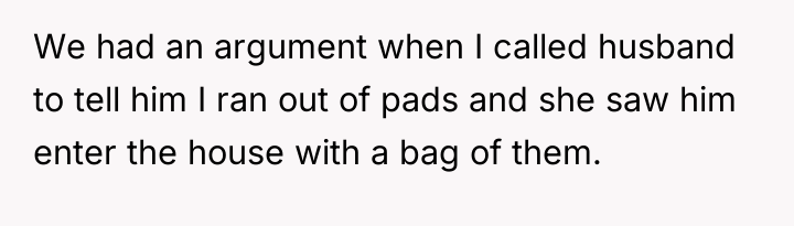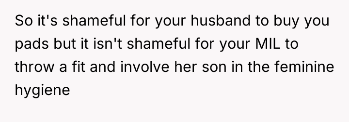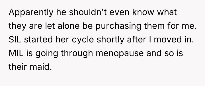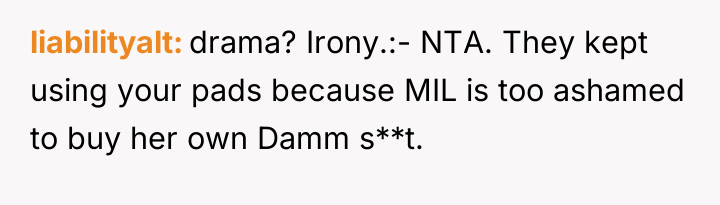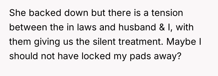 The MIL’s reaction suggests a deep-seated cultural or personal discomfort with the topic of menstruation, viewing the OP's proactive boundary setting (locking the supplies) as selfish rather than a necessary self-care measure. Furthermore, the MIL applied emotional leverage by involving the husband and threatening eviction, which shifts the dynamic from a discussion about shared supplies to a power struggle over the OP’s right to feel secure in her living situation. The SIL’s dependency, coupled with the MIL’s avoidance of purchasing or discussing pads, created an environment where the OP was unwittingly subsidizing the entire household's needs.