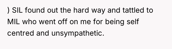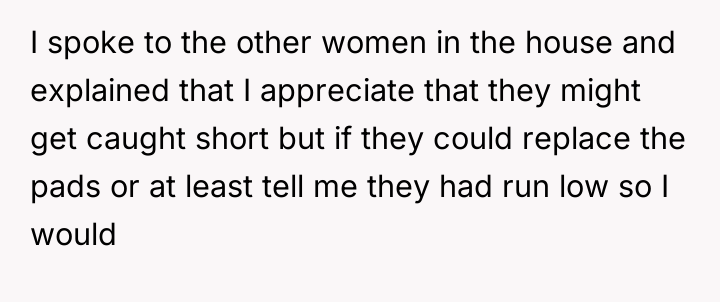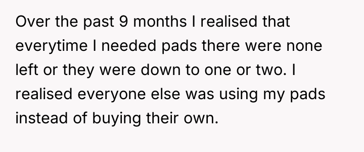 The OP’s action of securing the pads, while provocative, was an appropriate response to a pattern of boundary violation and resource depletion. A more constructive future approach would involve framing the issue strictly in terms of shared household finances or personal ownership rather than hygiene sensitivity, perhaps by presenting the MIL with a written budget breakdown showing the cost of pads over nine months. However, given the imminent move, prioritizing immediate self-sufficiency (as she did) over avoiding tension was a practical choice.