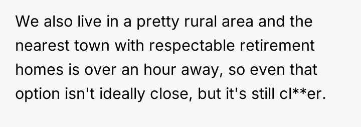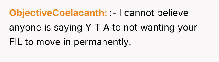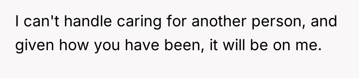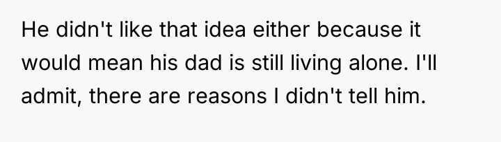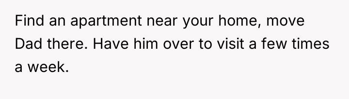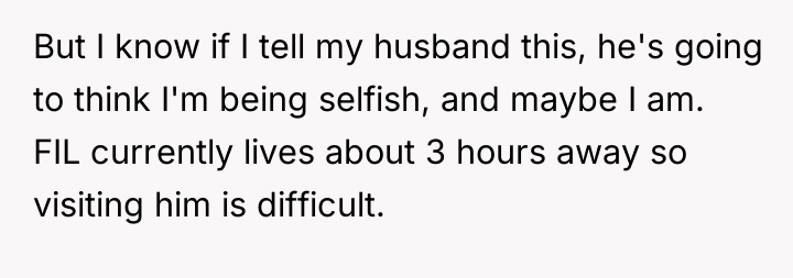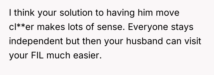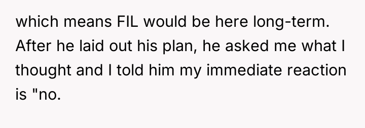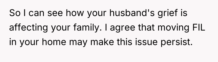 The wife's initial 'no' was an appropriate defense mechanism given the sudden, high-stakes nature of the proposal. Moving forward, she must communicate her concerns clearly, separating her support for her husband and father-in-law from the specific logistical and emotional impact of the cohabitation plan. A constructive recommendation is for the couple to pause any major move and instead focus on creating a structured support plan for the father-in-law that honors his needs without immediately sacrificing the children's stability or the wife's capacity.