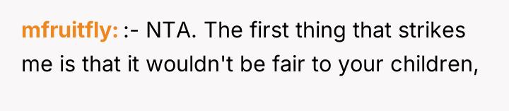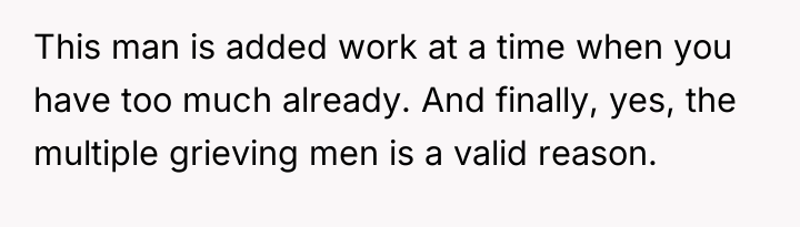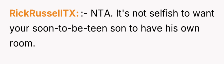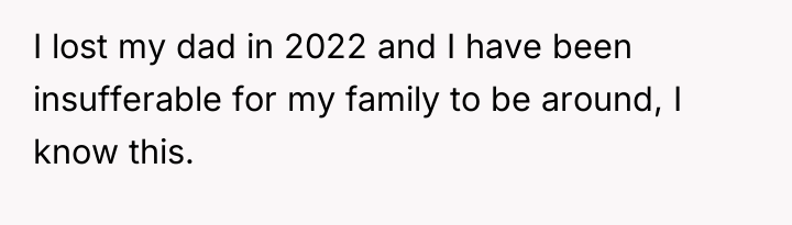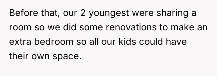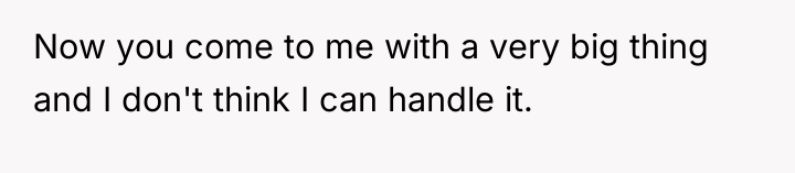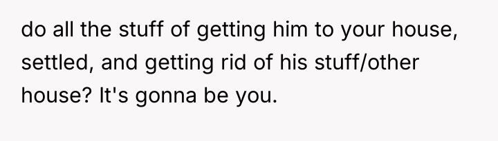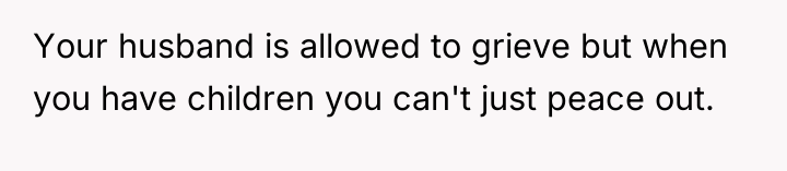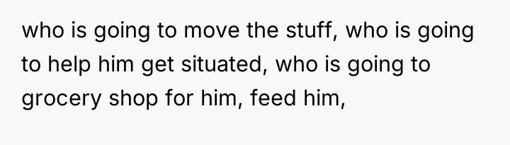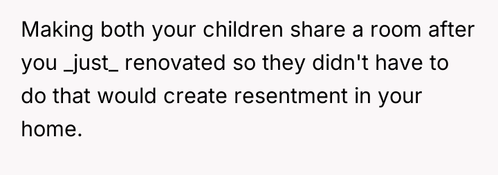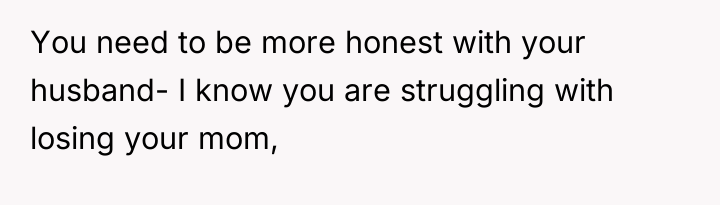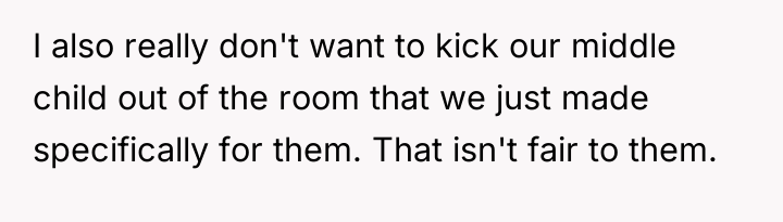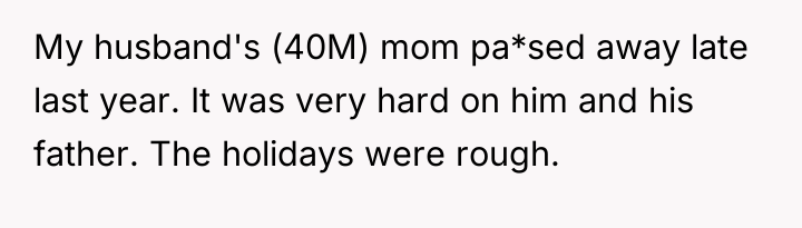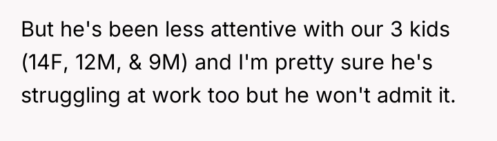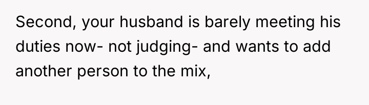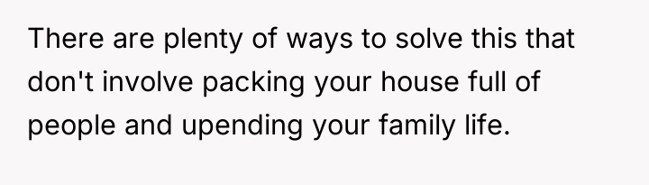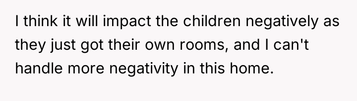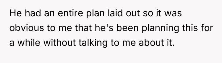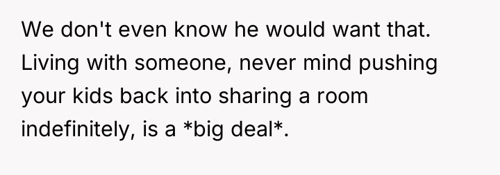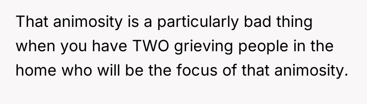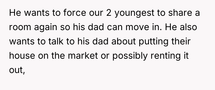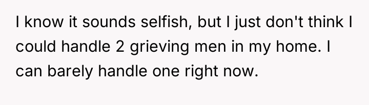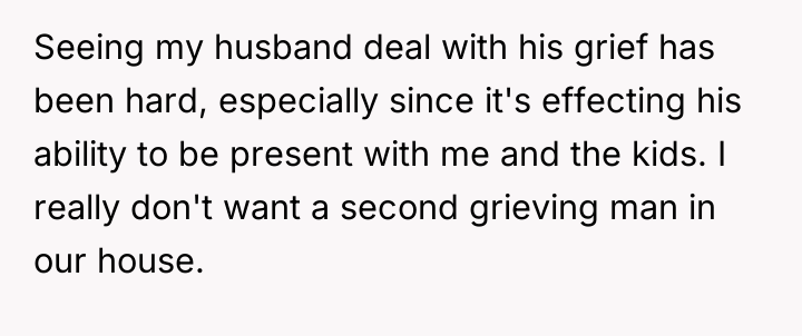 The husband's presentation of a fully formed plan indicates a lack of genuine collaborative communication, likely driven by anxiety related to his mother's passing and his own struggles, which he is attempting to manage by controlling his environment. His plan disregards established family needs, particularly the recent allocation of space for the middle child, and places a significant, unacknowledged emotional burden onto the wife. The wife's resistance is rooted in practical concerns (housing logistics) and emotional self-preservation (not wanting two grieving men to manage simultaneously), which are valid defenses of her established boundaries.
