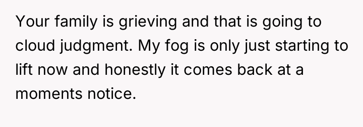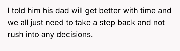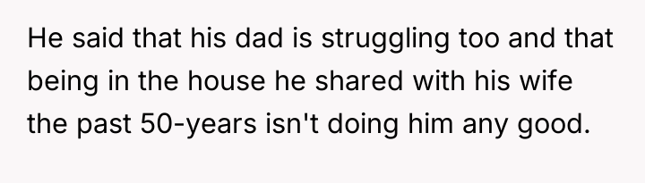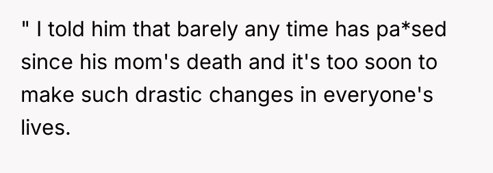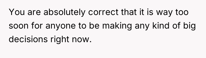 As renowned researcher Dr. Brené Brown explains, “Boundaries are the distance at which I can love you and me simultaneously.” This situation highlights a critical boundary conflict where the husband, motivated by intense grief and a desire to fix his father's situation, is attempting to impose a drastic change onto the existing family structure without adequate joint consideration.