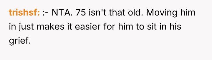 Given the husband's unilateral planning driven by grief and his rejection of alternative, less disruptive solutions for his father, is the wife justified in prioritizing her family's current living arrangement and her own emotional bandwidth over her husband's proposed immediate solution for his father's well-being?