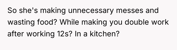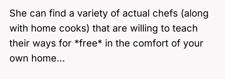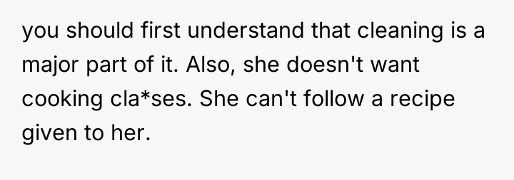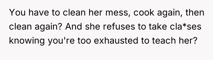 The husband, working as a professional chef for 12 hours daily, has a legitimate need for household efficiency. When his wife attempts to cook, the process creates double the labor for him: cleaning up the extensive mess and then cooking the actual meal because the first attempt is inedible. This is a failure of basic contribution and respect for his time. The wife's refusal to take formal lessons or accept basic instruction suggests either a defense mechanism against criticism or a misunderstanding of the commitment required when taking on a shared domestic task.