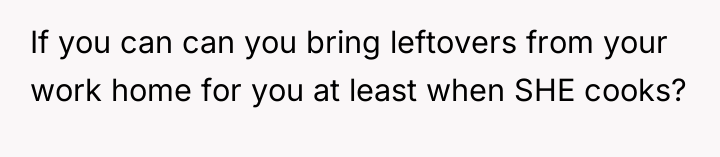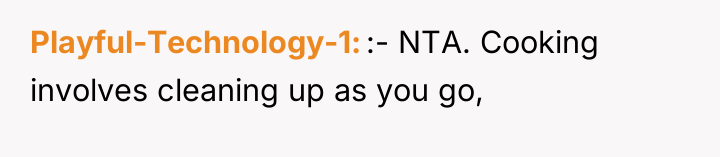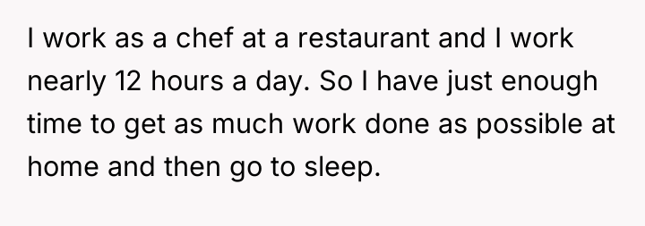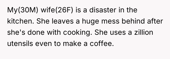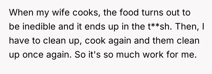 The husband expresses significant frustration because his wife's attempts at cooking result in inedible meals, excessive mess, and ultimately force him, despite his demanding 12-hour work schedule as a chef, to clean up, discard the food, and cook a second meal for himself. The central conflict lies between the wife's stated desire to learn to cook and the husband's practical need to maintain order and efficiency at home, exacerbated by his professional commitments.