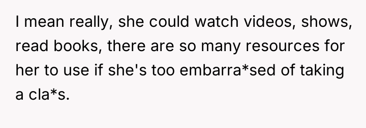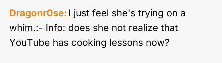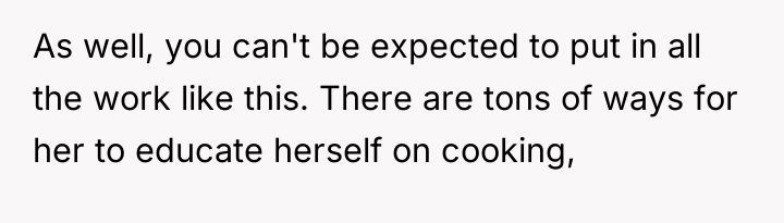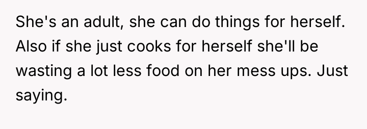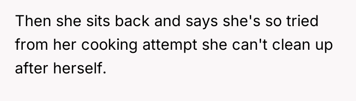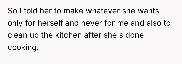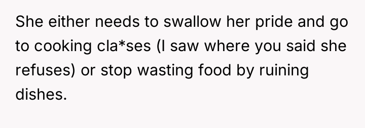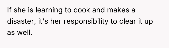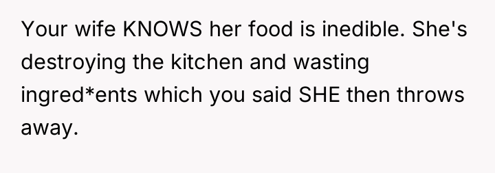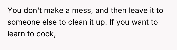 The husband's action of telling her to cook only for herself and clean up afterwards is an appropriate, direct boundary setting aimed at preventing further negative consequences (wasted food, double labor) while allowing her to practice without impacting his well-being. A constructive recommendation for future situations would be to negotiate a structured learning plan: perhaps she agrees to watch instructional videos or dedicate specific, short time slots to very simple recipes, with the explicit agreement that if the result is inedible, she cleans it all immediately, or he takes over without complaint about the mess.