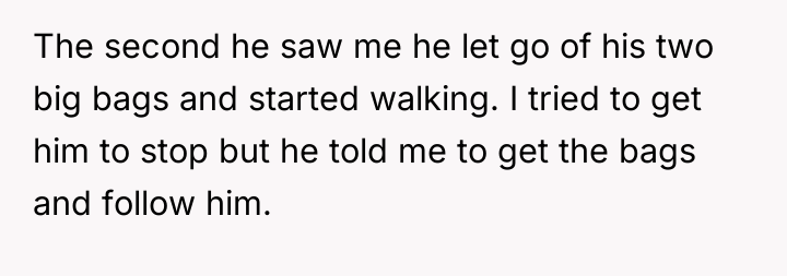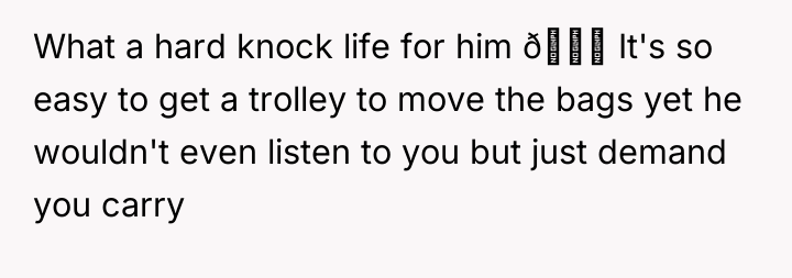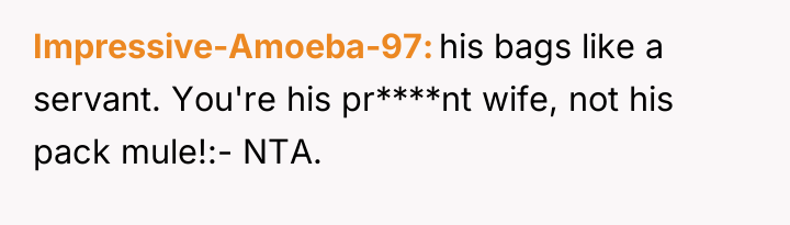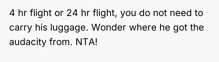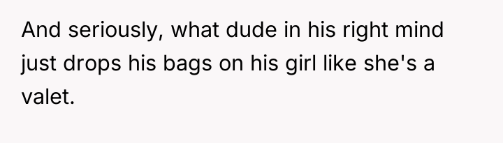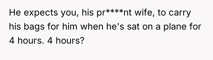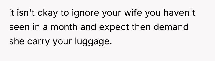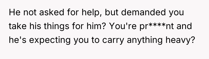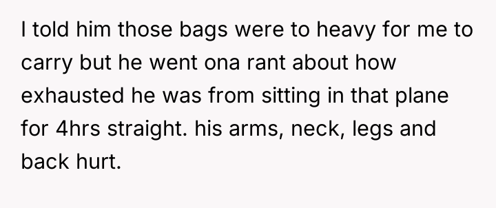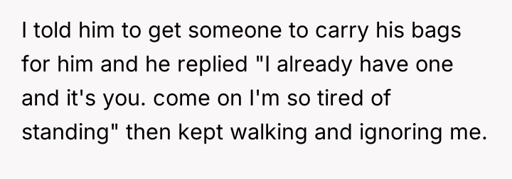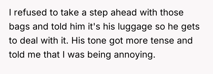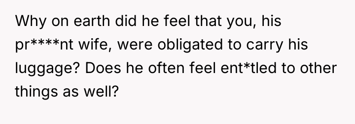 The husband's behavior—demanding service, dismissing his wife's pregnancy as irrelevant ("still in good shape"), and escalating his tone when refused—demonstrates a lack of empathy and a failure to recognize relational boundaries. His physical discomfort from a four-hour flight does not equate to the physical strain and risks associated with carrying heavy luggage while 12 weeks pregnant. By insisting his tiredness superseded her physical limitations and calling her annoying, he invalidated her reality. The OP’s reaction, while emotionally charged, was a direct consequence of feeling utterly dismissed and treated like an unpaid porter rather than a partner. Leaving the luggage was a clear, albeit dramatic, attempt to enforce a boundary that her verbal communication failed to establish.