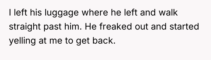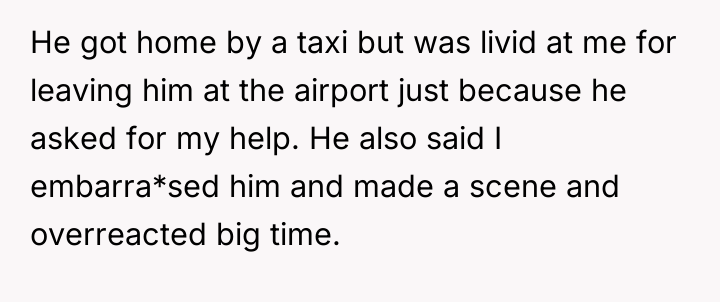The OP's action was an understandable reaction to an invalidating demand, but it escalated the conflict significantly. For future situations, the OP should establish clear, pre-agreed expectations about physical assistance during pregnancy, especially after travel. If a partner insists on unreasonable demands, a more constructive approach than abandonment might be to clearly state, "I cannot lift that safely; I am calling a porter/waiting here until you arrange transport for the bags," ensuring physical safety is prioritized without immediately resorting to leaving the partner stranded.