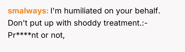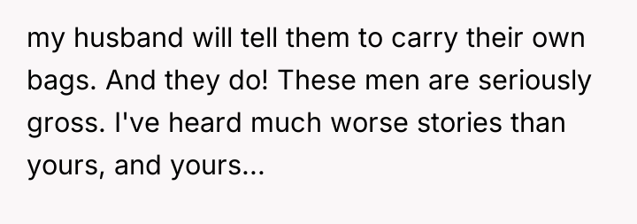 The original poster (OP) felt deeply disrespected and humiliated after her husband demanded she carry his heavy luggage immediately upon his return from a long trip, despite her being pregnant. The central conflict arose from the husband prioritizing his minor discomfort after a flight over acknowledging and accommodating his wife's pregnant physical limitations and expectations for a supportive reunion.