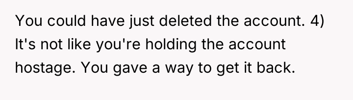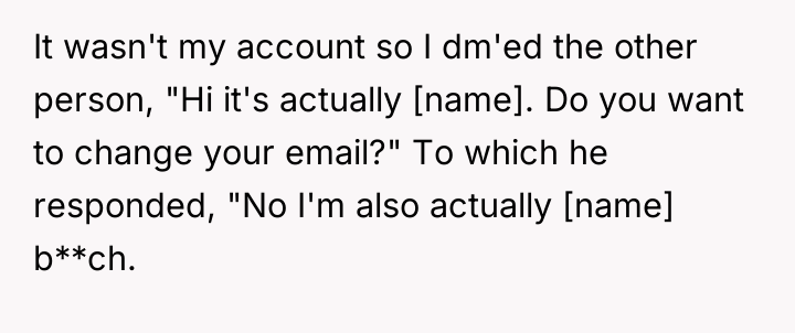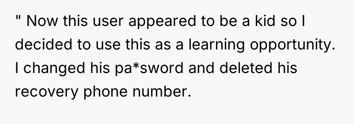 The situation described involves a dispute over a shared or similar digital identity, escalating rapidly into unauthorized access and control. The original poster (OP) perceived a violation of their identity space when encountering the similar account name. Their immediate response—changing the account password and deleting the recovery number—demonstrates a severe breach of personal and digital boundaries. While the initial interaction was hostile from the other user, the OP's reaction moved from defense into aggressive punitive action, which is a form of digital retaliation. This behavior suggests the OP prioritized asserting dominance and correcting the perceived wrong over clear, assertive communication or utilizing platform moderation tools.