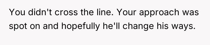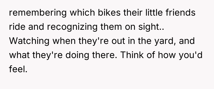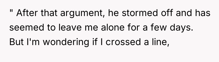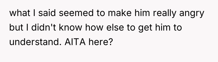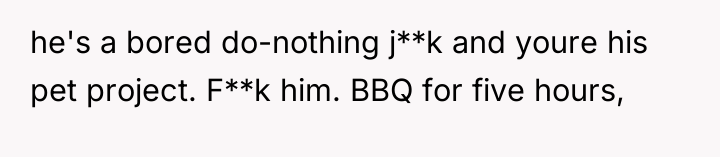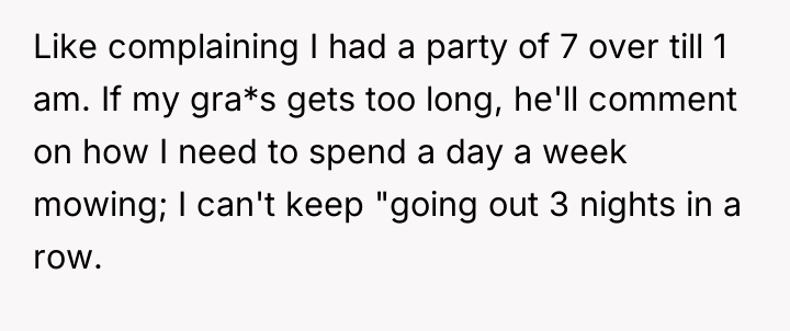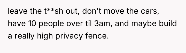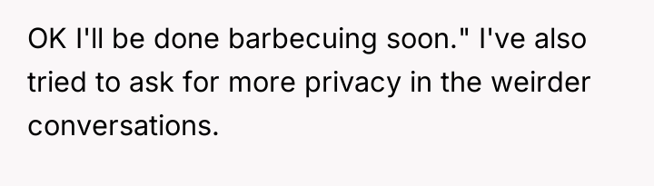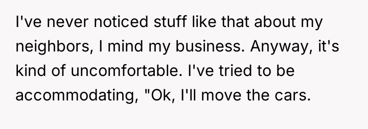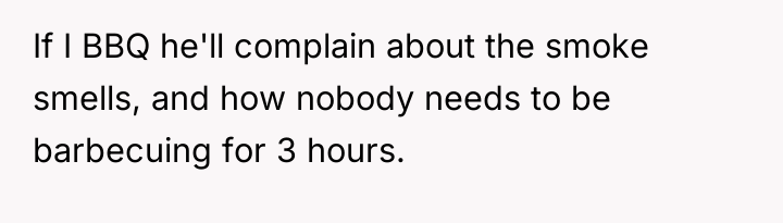The OP's initial attempts to accommodate William (moving cars, ending BBQs early) validated his intrusive behavior, setting a precedent that his complaints held power over the OP's personal life. When boundaries are repeatedly violated, the level of response often needs to escalate. The OP's final confrontation was a high-stakes attempt to shift the power dynamic by using an analogy designed to force empathy, which successfully achieved a temporary result (William leaving her alone). However, using an analogy involving a person's children can often trigger defensiveness, as it moves the discussion from external behaviors (mowing, BBQ smoke) to a perceived attack on his character as a father, explaining his anger.
