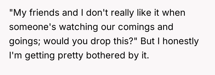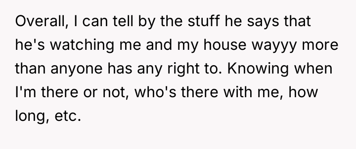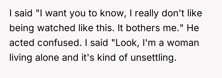 The OP was not wrong to defend her privacy, but framing the issue through the lens of 'being watched like a woman living alone' and then directly comparing it to his daughters being watched could be interpreted as manipulative or accusatory, even if factually true to her experience. A more constructive future approach would be to maintain a firm, non-emotional stance focused purely on agreed-upon property lines and legal rights (e.g., "I acknowledge your concern, but I will not discuss my guests or my schedule with you. Please stop observing my home.").