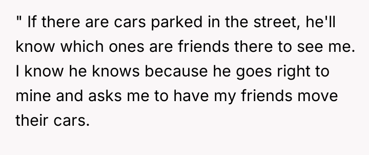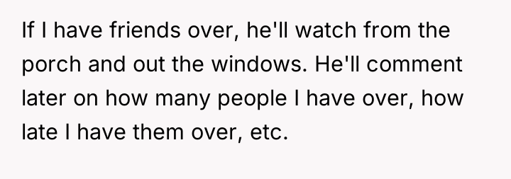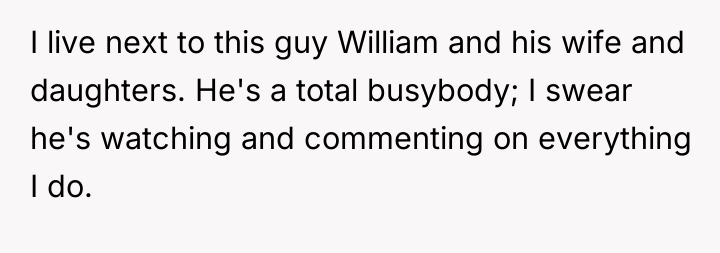 Living next door to William feels like living under a microscope, where every move is scrutinized and every moment is reported. His constant surveillance and unsolicited commentary turn what should be simple neighborly interactions into a suffocating ordeal, leaving a heavy weight of intrusion and discomfort hanging in the air.