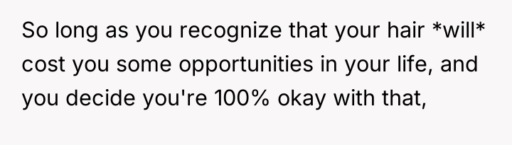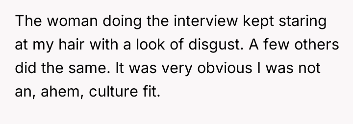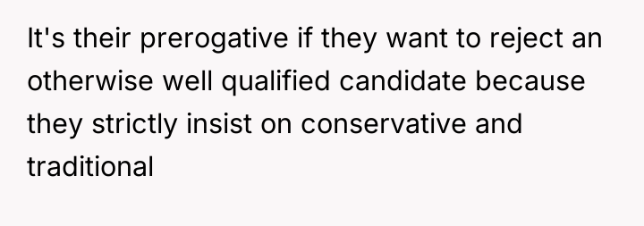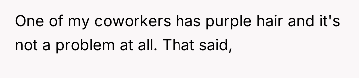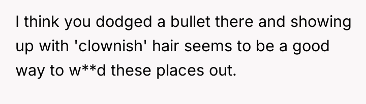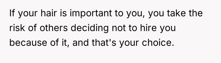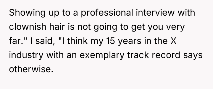 This situation highlights a common friction point in modern professional life: the tension between individual identity expression and corporate conformity. The OP values authenticity, demonstrated by maintaining their unique hair color for over a decade and stating that fitting in as they are is a 'stipulation' for employment. Conversely, the interviewer and company clearly prioritize a specific, traditional aesthetic, viewing the purple hair as 'clownish' and unprofessional. The OP’s experience in the industry (15 years) suggests competence, but the hiring decision, and subsequent aggressive feedback, indicates a strong emphasis on cultural fit over pure qualification in this specific environment.